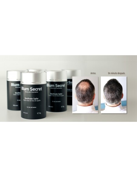Con el densificador capilar Blum Secret, cada cabello gana grosor y densidad instantáneamente. La sujeción de las fibras de pelo es tan fuerte que no necesita de ningún tipo de fijador o laca para evitar su caída, sin embargo el producto desaparecerá fácilmente al lavarse el pelo con champú. Al tratarse de fibras de algodón natural, Blum Secret es un producto que se puede usar de forma diaria al no irritar ni dañar la piel con su uso.
