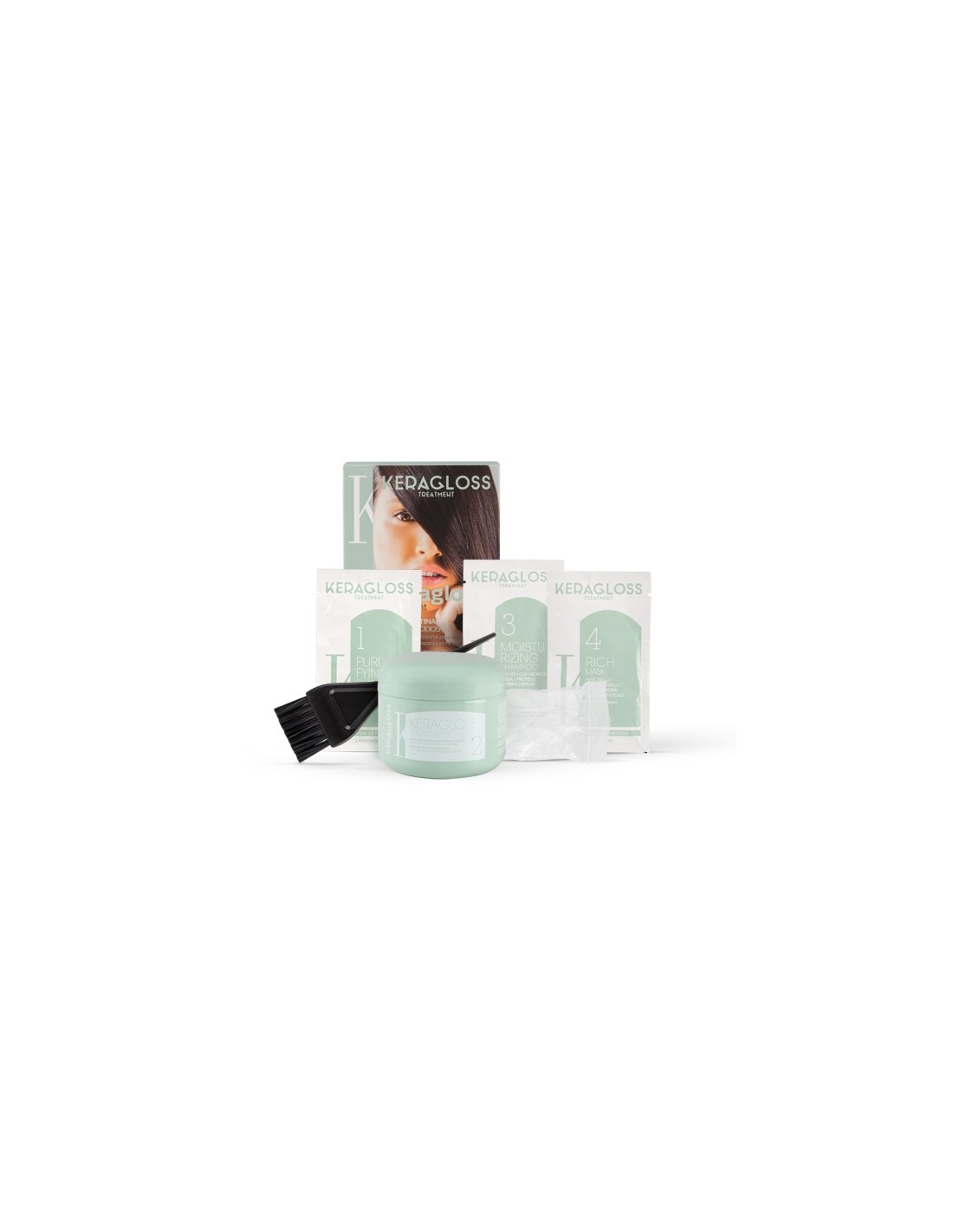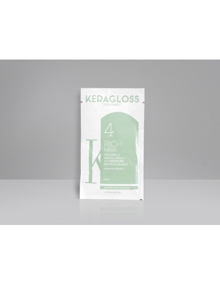 El kit monouso contiene: 1 sachet de 15 ml de champú, 1 tarro de 120ml de tratamiento, 1 sachet de 15ml de moisturizing champú, 1 sachet de 15ml de rich mask, 1 paletina, 1 par de guantes y folleto paso a paso.