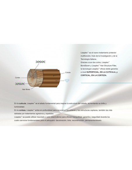 Este tratamiento protector, gracias a sus dos ciclos, Lisaplex BondSaver y Lisaplex Hair Structure Filler,actúa a varios niveles: superficial, en la cutícula y la corteza.