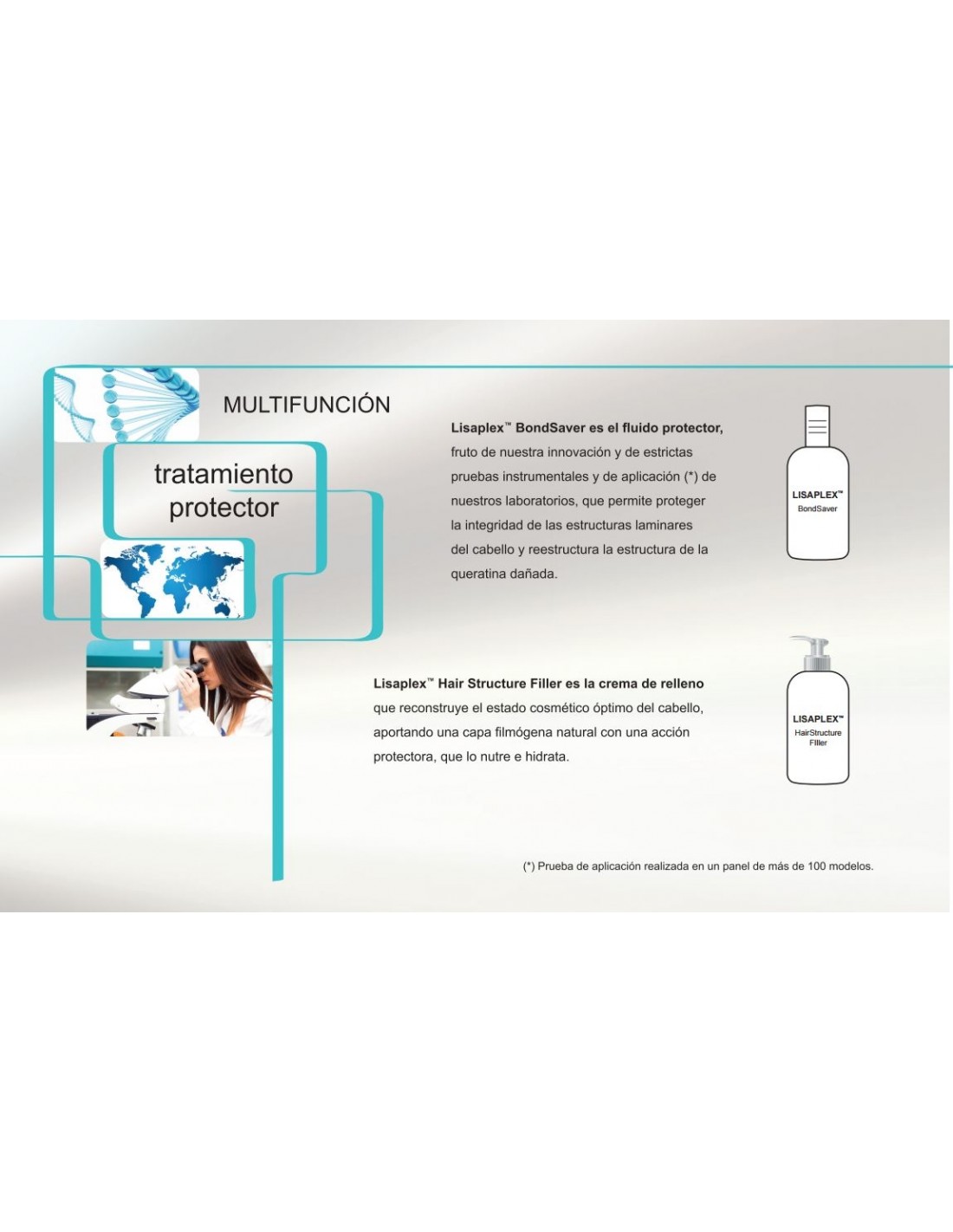 Lisaplex BondSaver fluido protector, enriquecido con Vegetal Protein Complex. Protege la integridad de la estructura capilar del cabello, reestructura y reconstruye el complejo queratínico dañado..