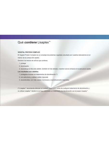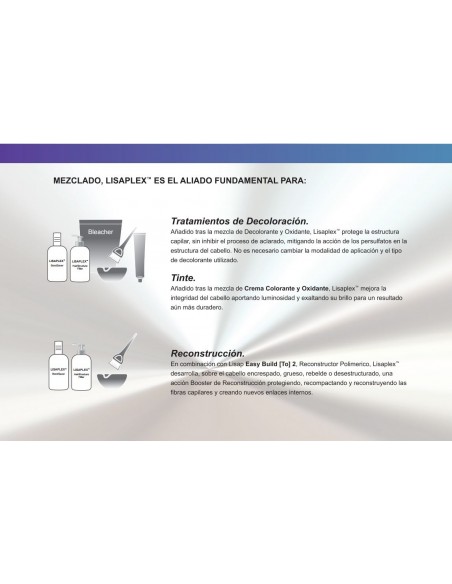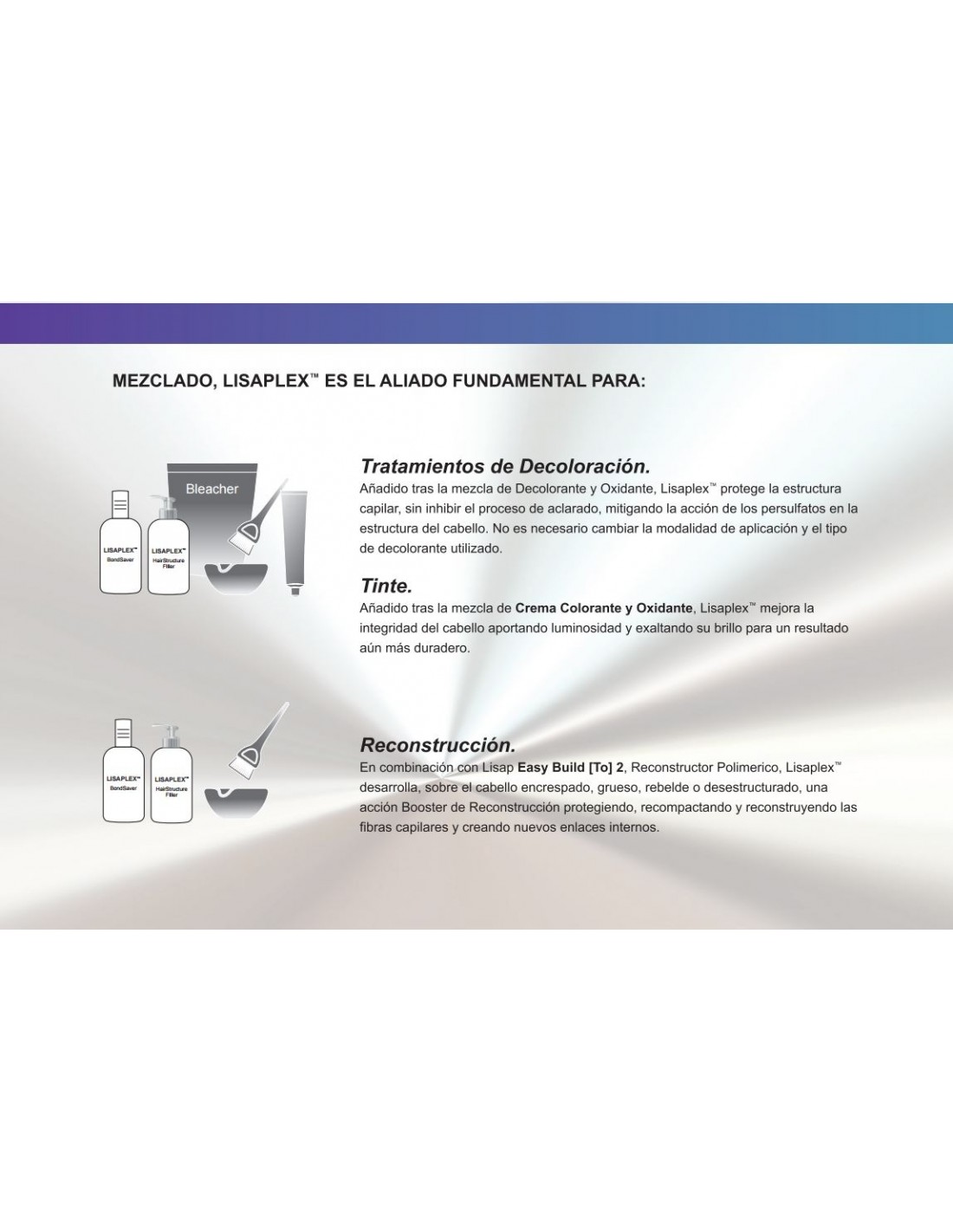 - Lisaplex se puede usar en el proceso de reconstrucción para obtener un Booster Effect, gracias a su complejo de proteínas vegetales, Vegetal Protein Complex (que protege, recompacta y reconstruye las fibras creando nuevos vínculos internos), y gracias a la acción integrada con LisapEasy Build To, Reconstructor Polimérico.