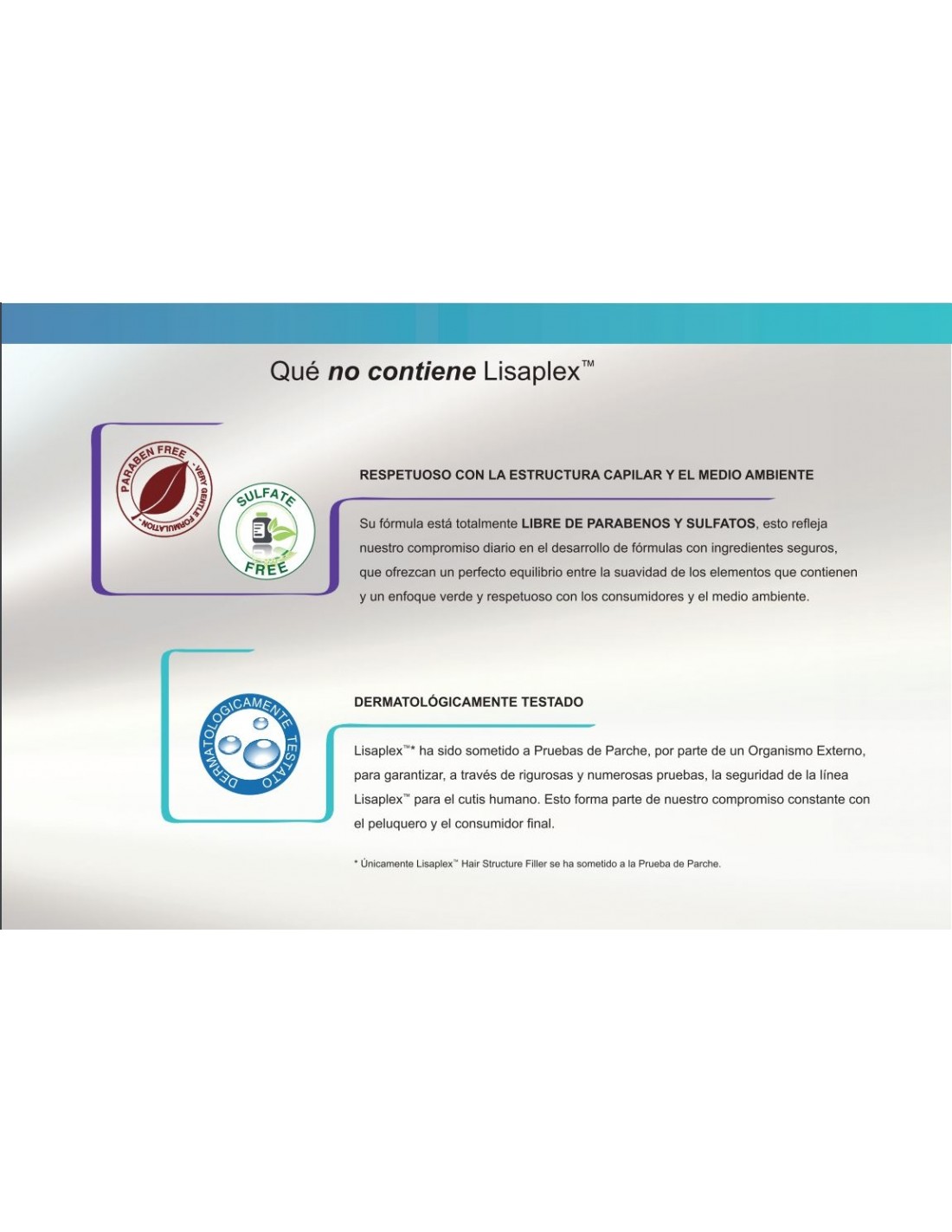 La fórmula de Lisaplex está libre de parabenos y sulfatos.Desde Lisap desarrollan fórmulas con ingredientes seguros, bajo un enfoque verde y respetuoso con los consumidores y el medio ambiente.