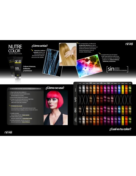 Nutre Color es una coloración temporal que aporta nutrición y brillo además de color. No altera el cabello natural, el color desaparece progresivamente con los lavados. Colores intensos y brillantes, gracias a una cuidada selección de pigmentos de color, reaviva colores apagados y aporta la máxima nutrición de una mascarilla capilar. Ideal para mantener el color entre tinte y tinte.